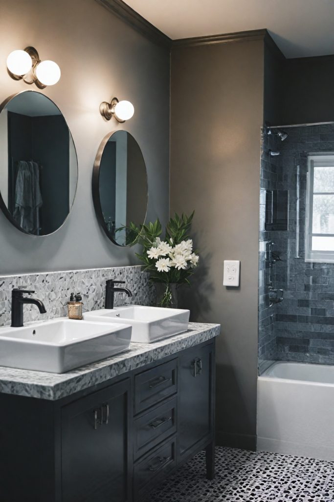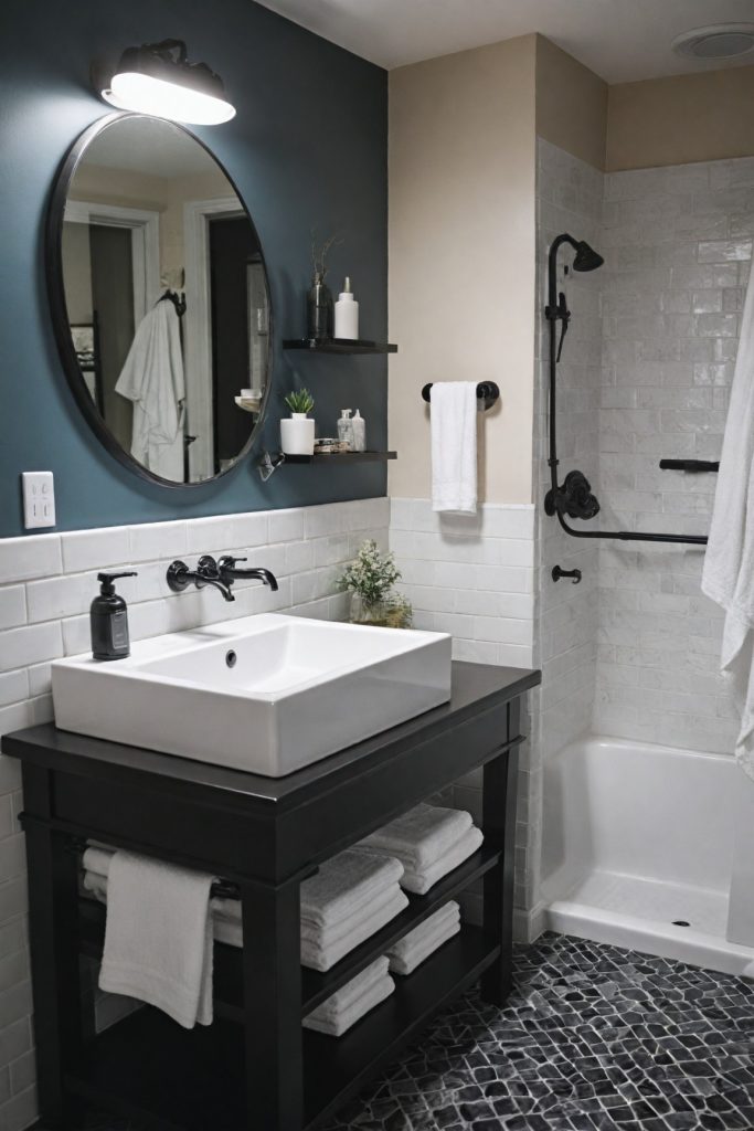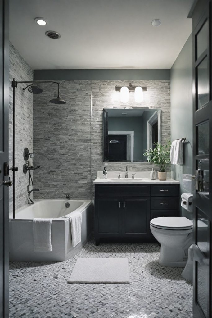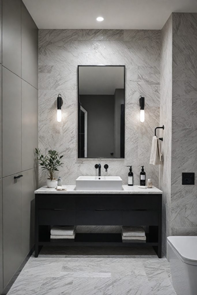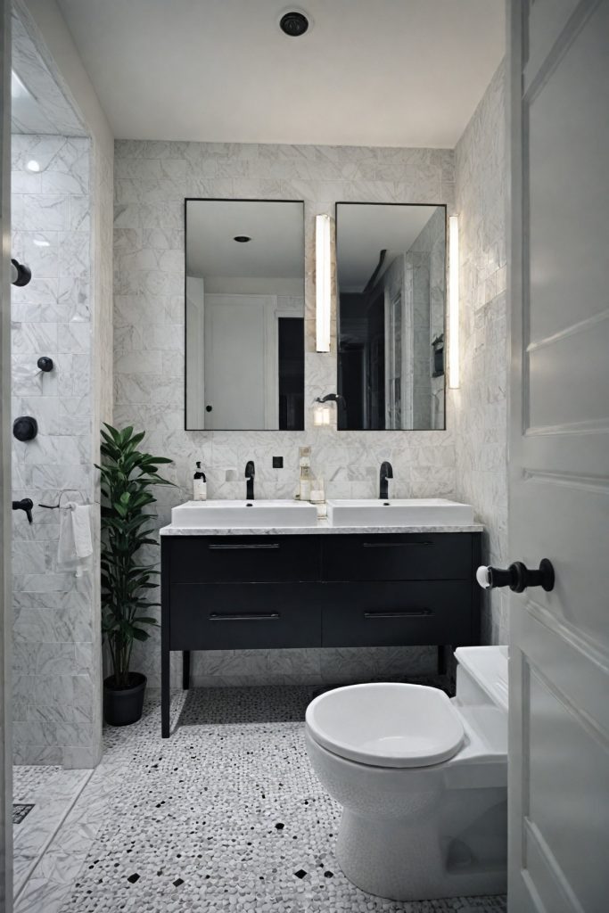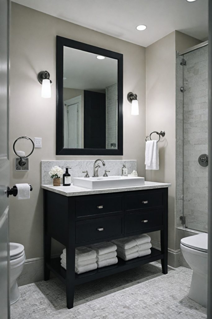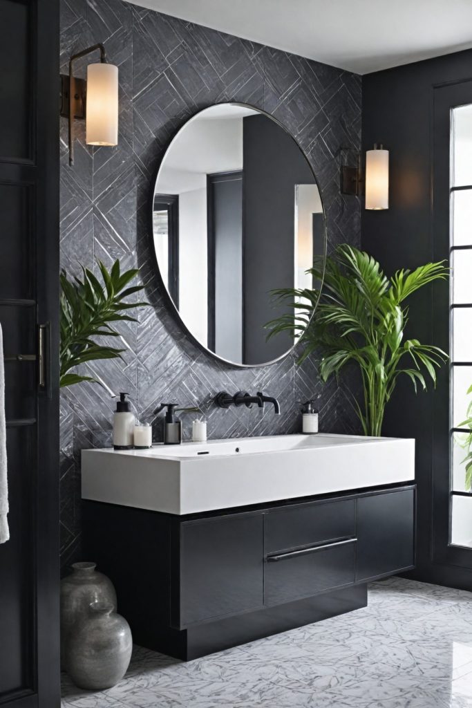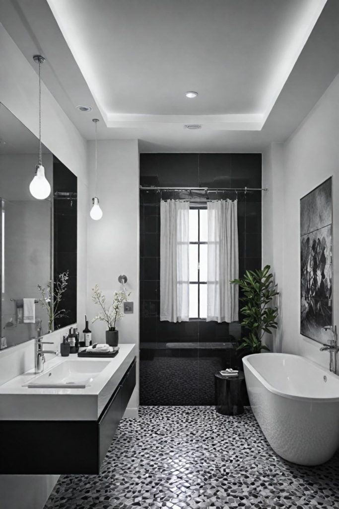 To enhance the monochrome aesthetic, consider adding geometric patterns or textures in your accessories and decor. Black and white striped towels, a patterned shower curtain, or a mosaic tile backsplash can introduce visual interest while staying true to the elegant monochromatic theme. The key is to balance these elements to create a cohesive look that exudes modern sophistication.