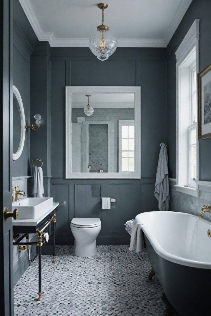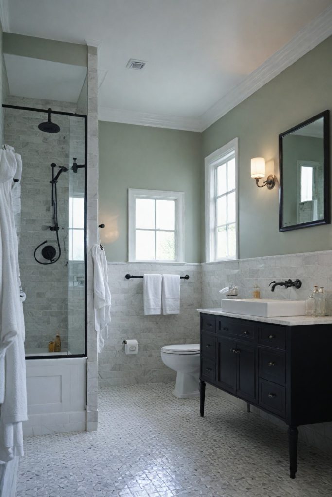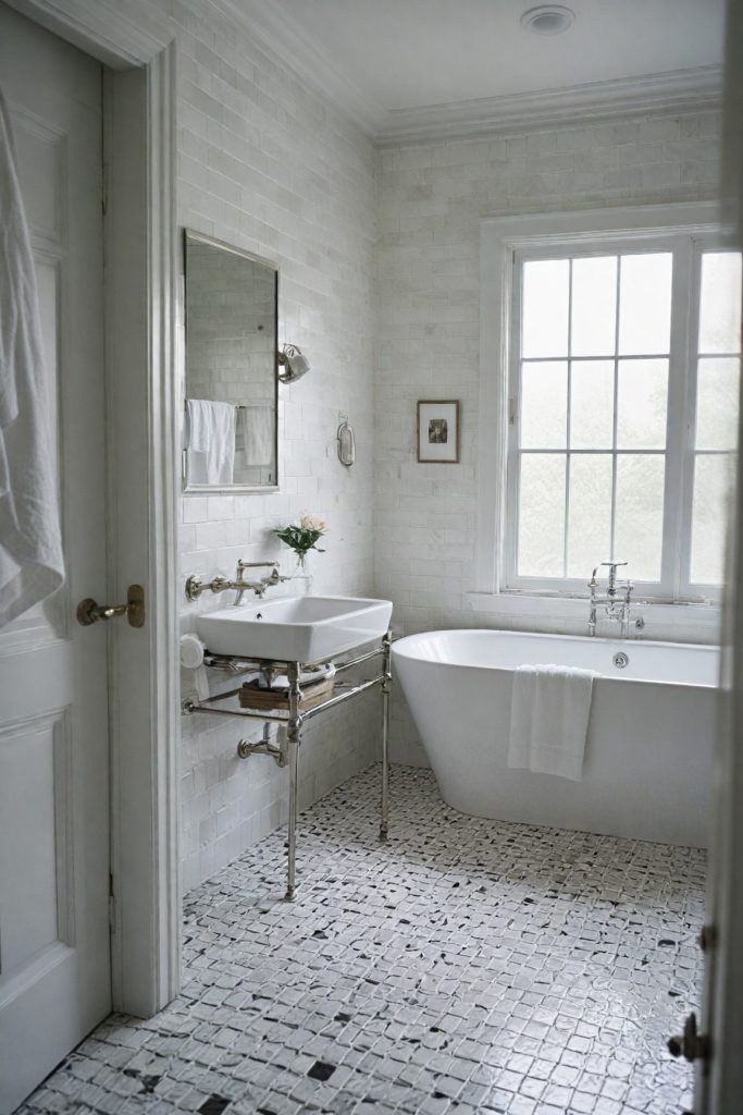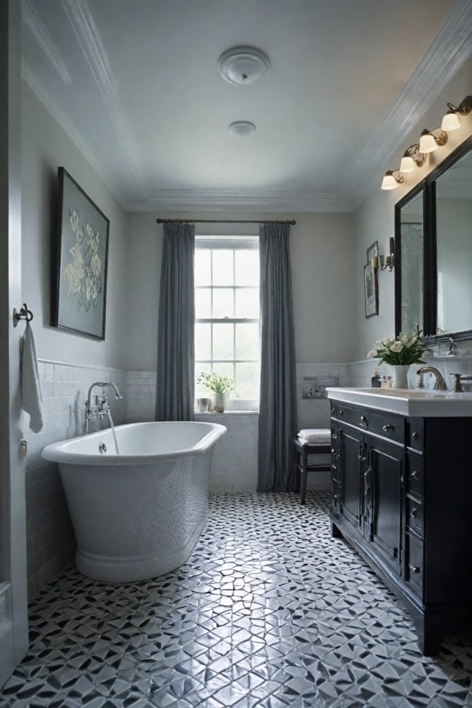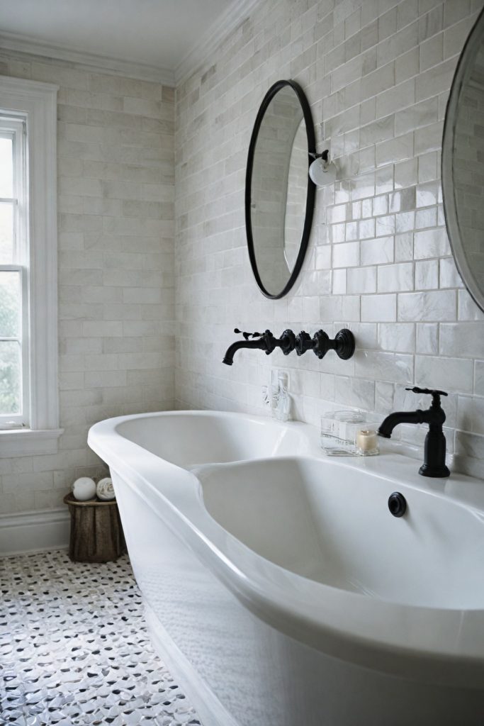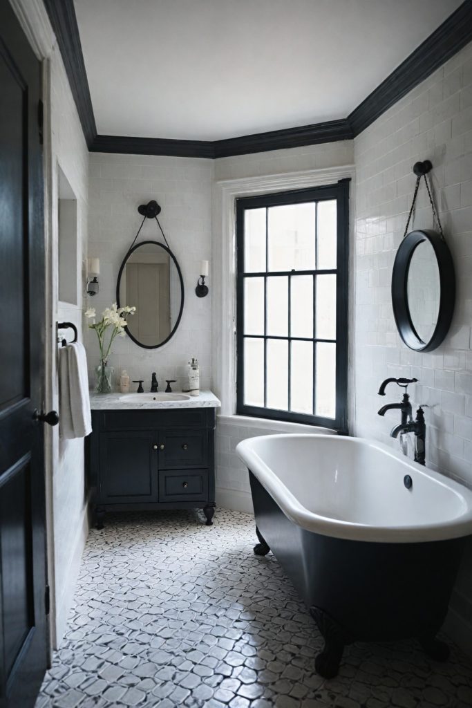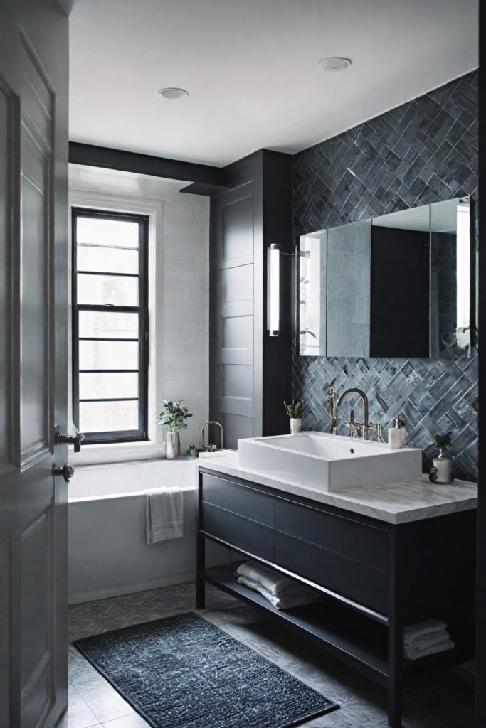 Opt for black and white tiles with geometric patterns to add visual interest and depth to the bathroom. This can create a bold statement while maintaining a sense of elegance. Contrast the monochrome palette with metallic accents such as brushed nickel or matte black hardware to introduce a touch of modernity and sophistication.