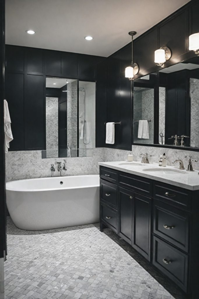 To elevate your bathroom with timeless elegance, start by selecting high-quality fixtures and finishes in shades of black and white. Opt for sleek matte black faucets, handles, and showerheads to add a touch of luxury. Contrast these elements with white marble countertops or tiles to create a striking visual impact. Introducing geometric patterns or textures can further enhance the monochrome theme and add depth to the space.