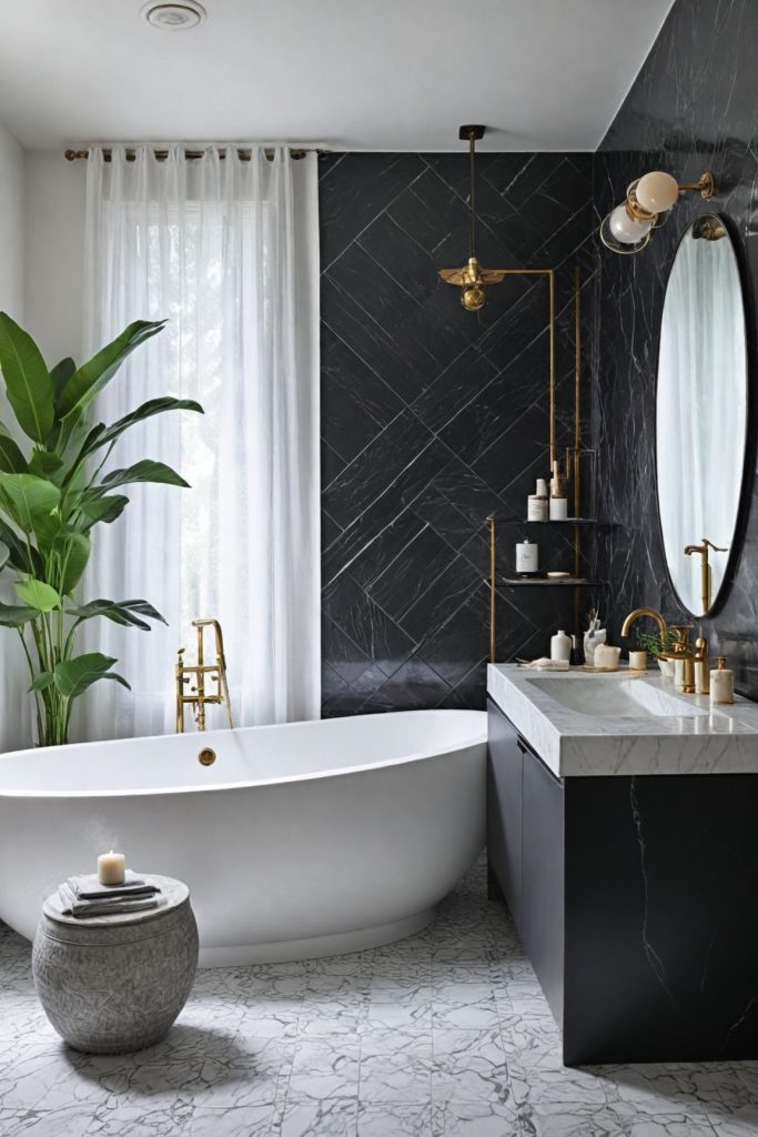 Incorporate sleek and modern fixtures such as matte black faucets, pendant lights, and hardware to elevate the overall look of your bathroom. Consider using marble or granite countertops to add a touch of luxury and texture to the monochrome palette. To enhance the sense of sophistication, opt for geometric patterns or minimalist artwork in black and white tones to adorn the walls.